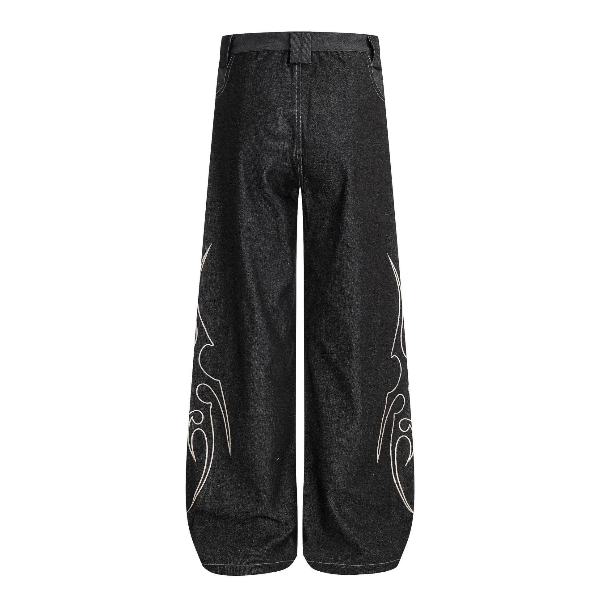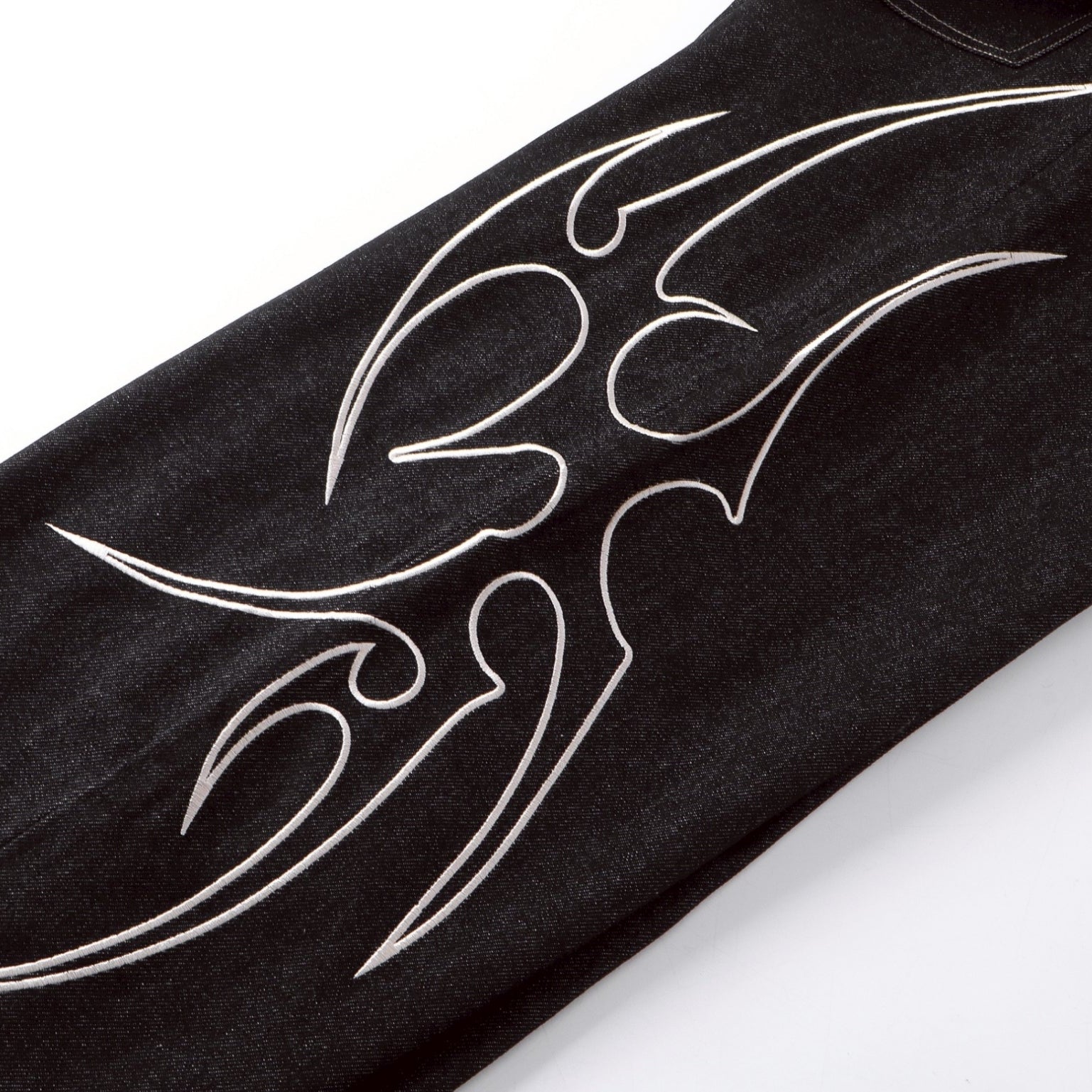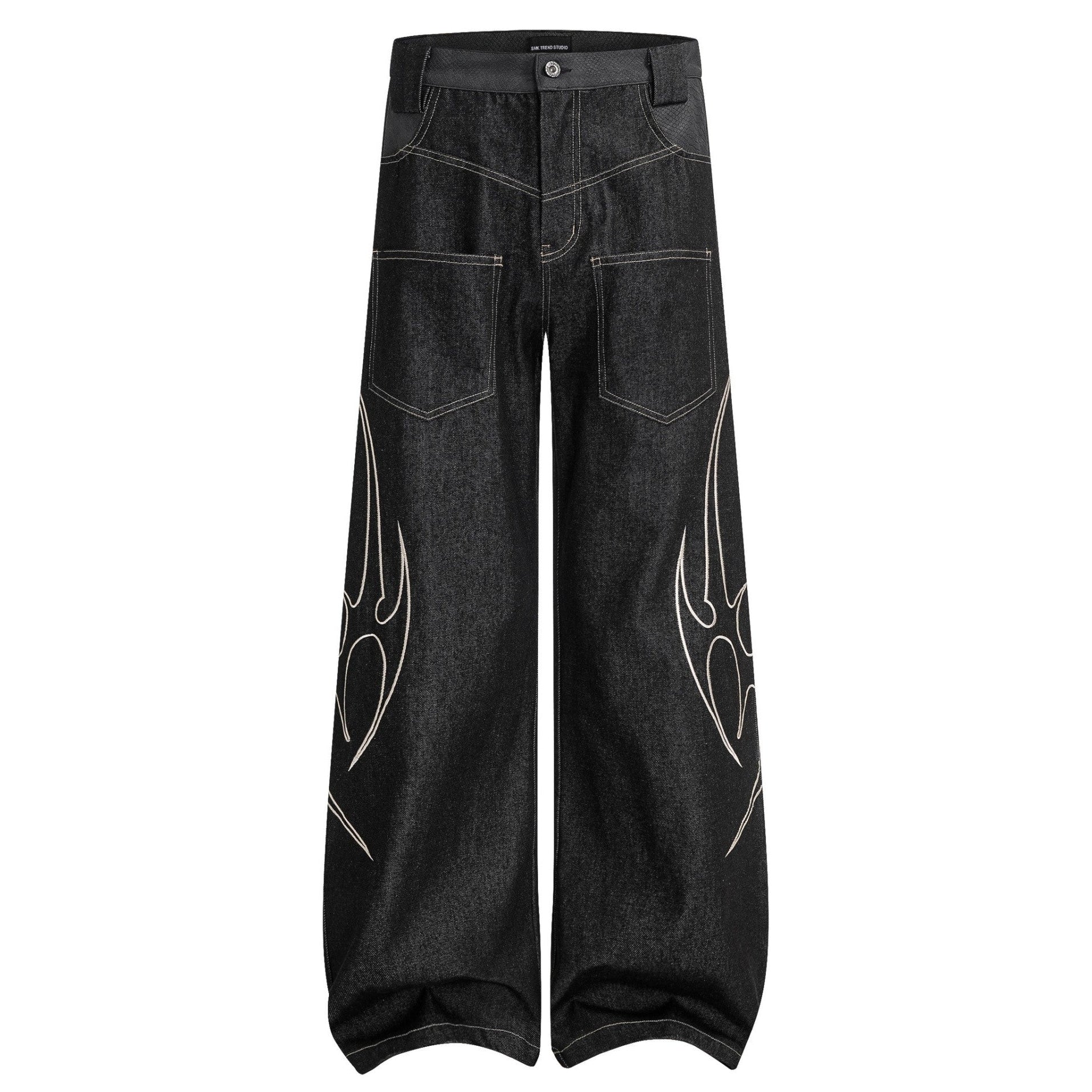 【4/1 發售】菱格紋皮質 刺繡火焰圖騰 彎刀丹寧褲
